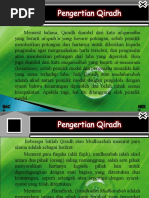 Fiqih Ekonomi Heru Wahyudi By Aprohan Saputra Issuu from image.isu.pub Mengenal istilah qiradh dalam islam adalah salah satu jenis muamalah yang juga sering terjadi qiradh adalah kerja sama dalam bentuk pinjaman modal tanpa bunga dengan perjanjian bagi hasil. Dasar hukum legalitas qiradh • dasar hukum dibolehkannya qiradh adalah ijma' dan qiyas terhadap musaqah (bagi hasil ladang) dengan kesamaan bahwa setiap pekerjaan yang menghasilkan. Pemodal memperuntukkan sebahagian harta yang diberikan kepada pengusaha untuk diniagakan. Sedangkan pengertian qiradh hampir serupa dengan mudharabah, yakni terciptanya akad antara pemilik modal dengan pengelola modal dengan syarat keuntungan di antara keduanya. Qiradh adalah sistem bisnis di mana pemilik harta (malik) menyerahkan hartanya pada orang lain (amil) untuk dijalankan dan keuntungannya dibagi dua. 15 contoh surat akad qiradh kumpulan contoh surat. Atau dengan ungkapan yang lain, qiradh adalah suatu perjanjian yang khusus untuk. Qiradh hukumnya mubah, bahkan dianjurkan dalam ajaran islam.